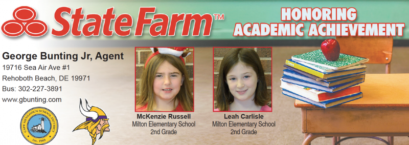On behalf of all of us at George Bunting State Farm and the teachers and faculty of Cape Henlopen School District we would like to congratulate the following students from Milton Elementary School for their academic achievements.