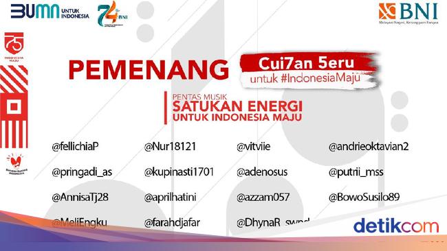 Pemenang yang beruntung adalah detikers yang telah mengirimkan harapannya untuk Indonesia melalui akun Twitternya. Para pemenang pun akan mendapatkan hadiah berupa saldo e-wallet LinkAja sebesar Rp 250.000,000 untuk masing-masing pemenang. Ini dia daftar pemenangnya.