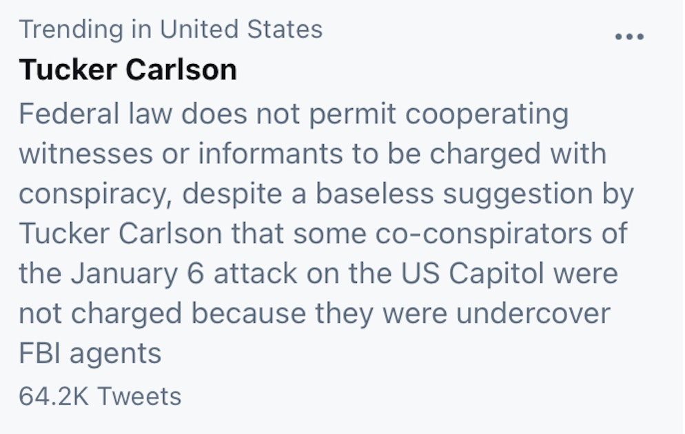 A midweek civics lesson from Twitter: “Federal law does not permit cooperating witnesses or informants to be charged with conspiracy, despite a baseless suggestion by Tucker Carlson that some co-conspirators of the January 6 attack on the US Capitol were not charged because they were undercover FBI agents.” I’m more confused than I was before I read that and typed it out, so job well done. Agent provocateurs were clearly everywhere that day, just like last summer when tall Terminator men in all black combat gear were caught on smartphones smashing windows and planting bricks in Minneapolis.