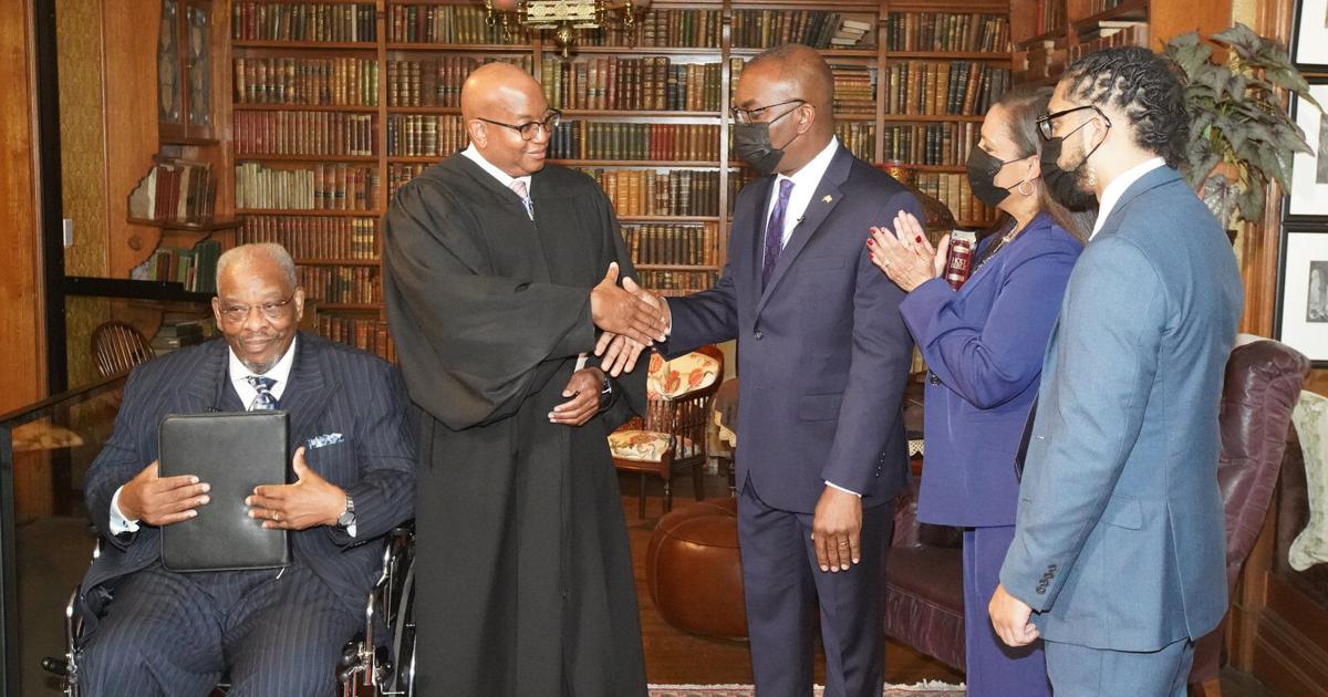 Mayor Byron W. Brown takes the oath of office surrounded by his wife, Michelle, and son Byron. The oath was administered by Buffalo City Court Judge Craig D. Hannah along with Pastor William Gillison, far left, at Theodore Roosevelt Inaugural National Historic Site on Delaware Avenue in Buffalo.